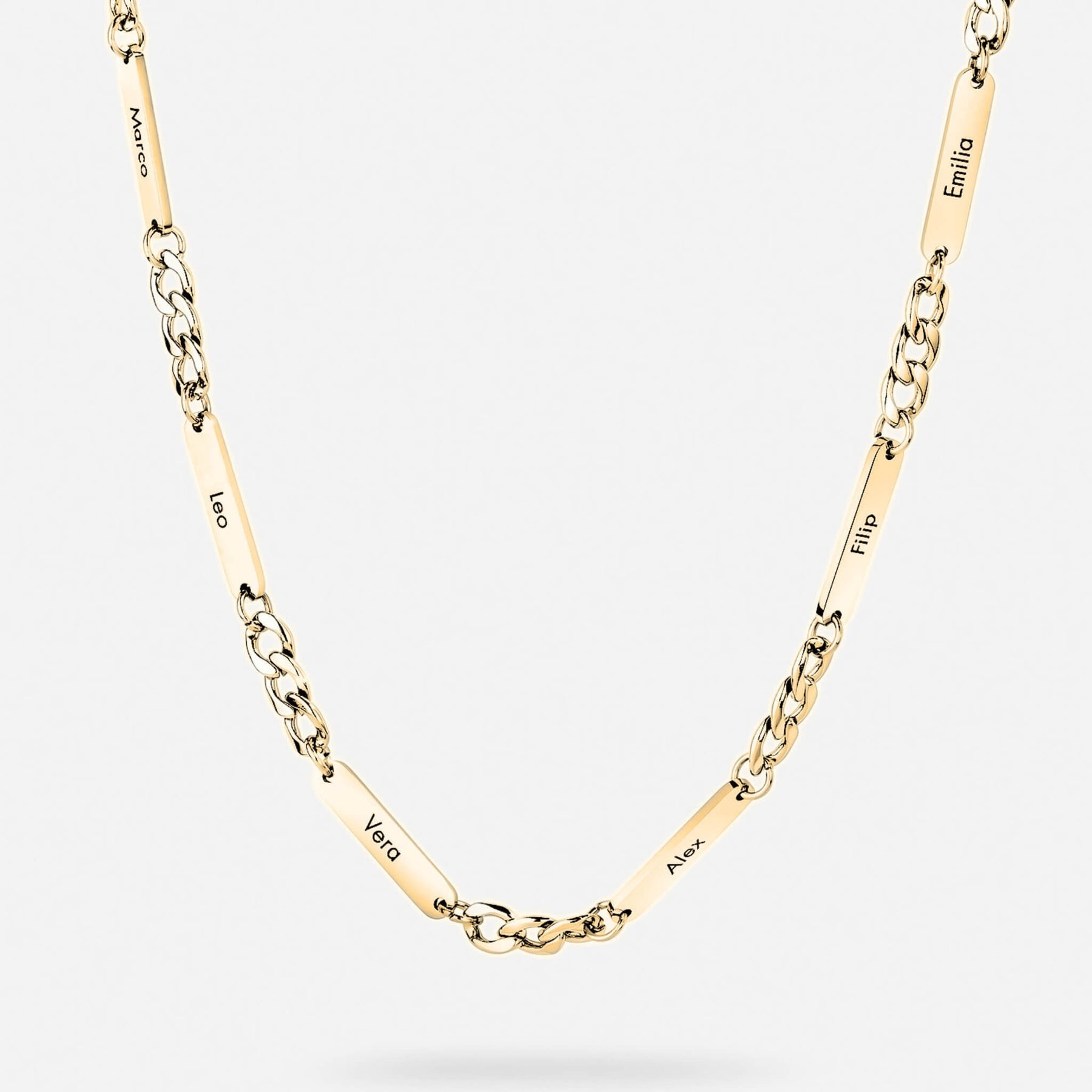 Each bar can be engraved with a name, date, or word — a subtle way to keep what matters most always close. Made for daily wear, the Personalised Name Link Necklace blends bold design with sentimental value.